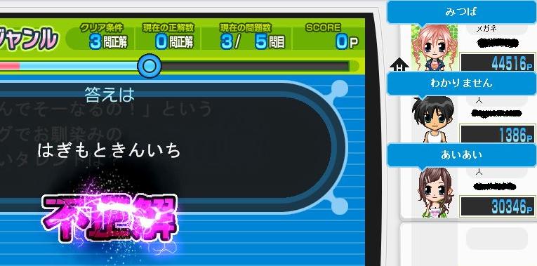 正解が「はぎもときんいち」に対して回答が「みつば」やら「あいあい」やら^q^もう何の問題だったのかさっぱり^q^